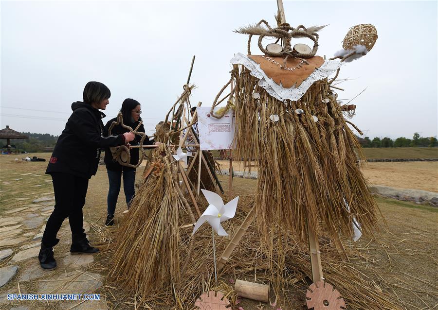NANJING, noviembre 11, 2018 (Xinhua) -- Estudiantes de la Universidad Forestal de Nanjing, elaboran esculturas de paja durante un concurso de dise?o, en el parque agrícola Xitian, en Nanjing, capital de la provincia de Jiangsu, en el este de China, el 11 de noviembre de 2018. (Xinhua/Sun Can)