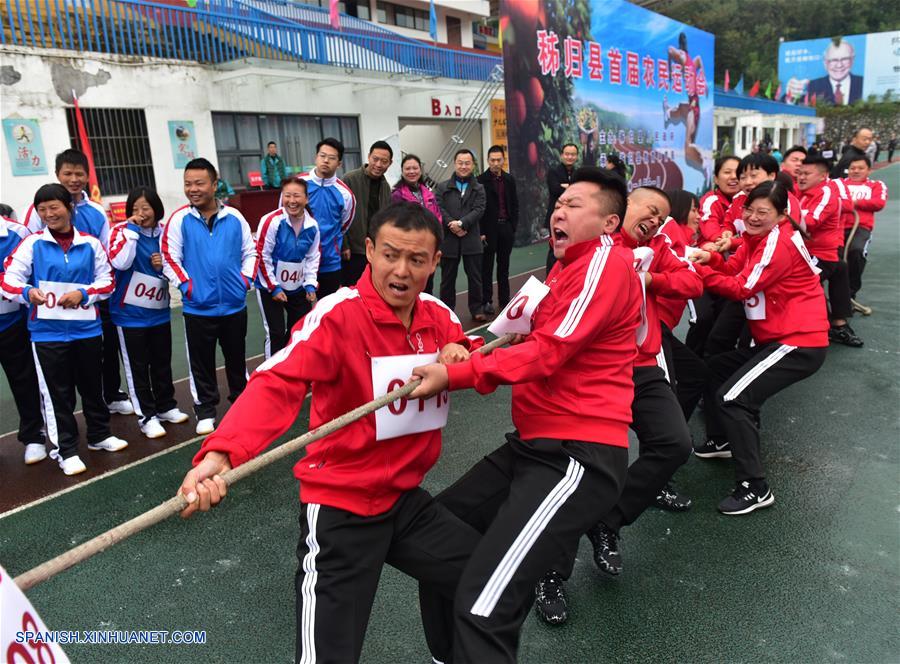 HUBEI, noviembre 12, 2018 (Xinhua) -- Imagen del 11 de noviembre de 2018 de granjeros compitiendo durante una reunión deportiva para celebrar la cosecha en el condado Zigui de la ciudad de Yichang, en la provincia de Hubei, en el centro de China. (Xinhua/Wang Huifu)