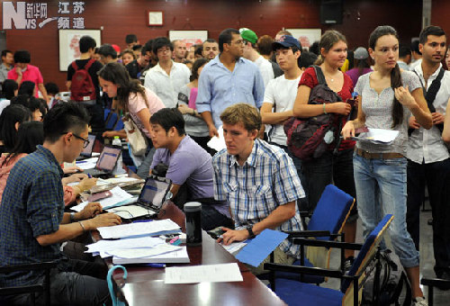 Los estudiantes extranjeros están haciendo trámites de la matrícula en la Universidad de Nanjing. [Foto / Xinhua]