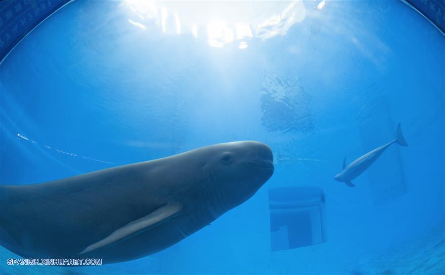 HUBEI, noviembre 13, 2018 (Xinhua) -- Imagen del 10 de noviembre de 2018 de un cuidador brindando adiestramiento de atención médica a marsopas sin aleta del Yangtze en el Acuario de Delfines Río Yangtze del Instituto de Hidrobiología de la Academia de Ciencias de China, en Wuhan, capital de la provincia de Hubei, en el centro de China. Con una boca ligeramente curvada, la marsopa sin aleta del Yangtze es a menudo llamada "ángel sonriente" del Yangtze por los chinos. Sin embargo, la población ha estado disminuyendo rápidamente en las últimas tres décadas debido al deterioro ambiental. La especie está ahora al borde de la extinción con una población de alrededor de 1,000 en la vía fluvial principal del Yangtze, de acuerdo con una investigación realizada en 2012. (Xinhua/Xiao Yijiu)