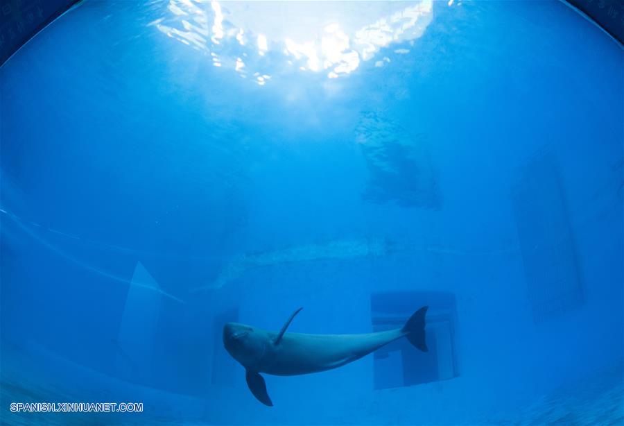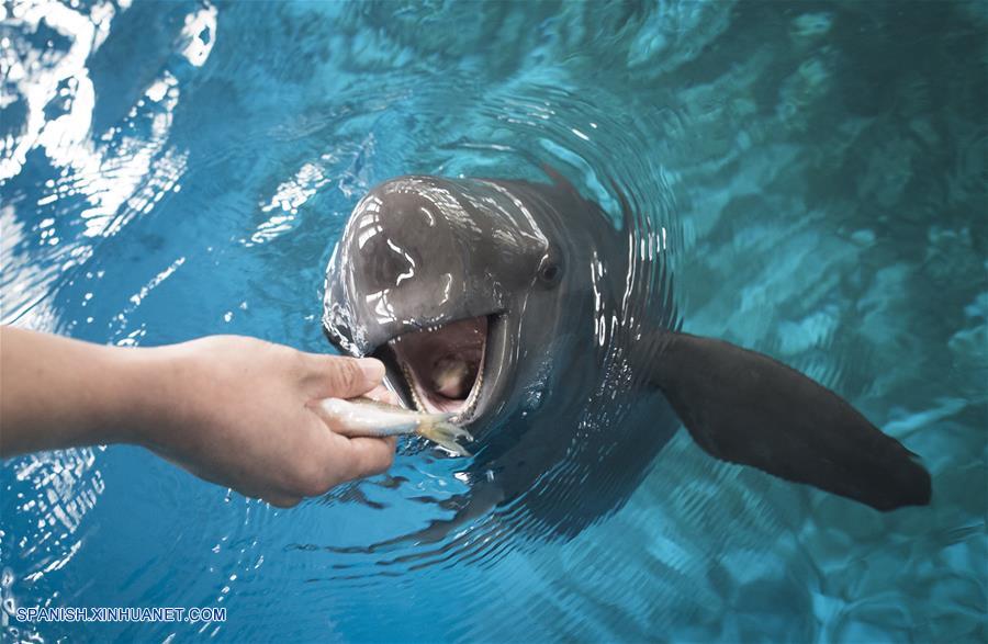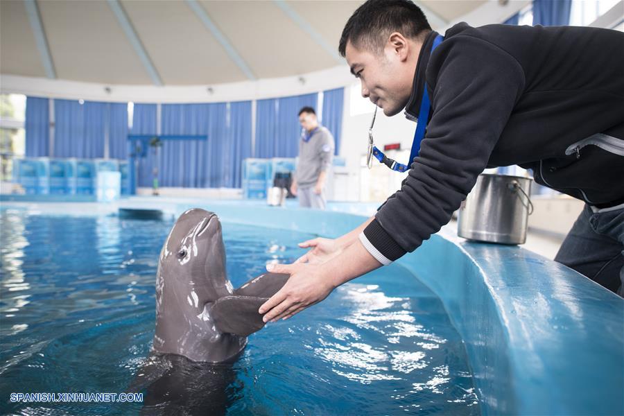 HUBEI, noviembre 13, 2018 (Xinhua) -- Imagen del 10 de noviembre de 2018 de un cuidador brindando adiestramiento de atención médica a las marsopas sin aleta del Yangtze en el Acuario de Delfines Río Yangtze del Instituto de Hidrobiología de la Academia de Ciencias de China, en Wuhan, capital de la provincia de Hubei, en el centro de China. Con una boca ligeramente curvada, la marsopa sin aleta del Yangtze es a menudo llamada "ángel sonriente" del Yangtze por los chinos. Sin embargo, la población ha estado disminuyendo rápidamente en las últimas tres décadas debido al deterioro ambiental. La especie está ahora al borde de la extinción con una población de alrededor de 1,000 en la vía fluvial principal del Yangtze, de acuerdo con una investigación realizada en 2012. (Xinhua/Xiao Yijiu)