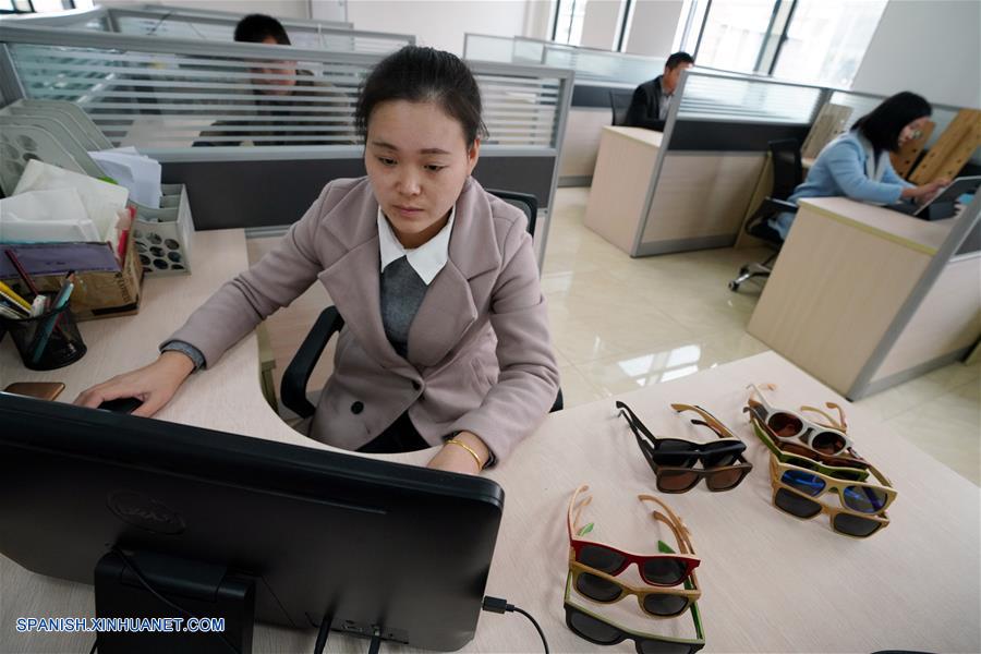 JIANGXI, noviembre 13, 2018 (Xinhua) -- Una empleada atiende órdenes en línea de monturas de gafas de bambú, en la empresa de Luo Xiaoping, en el condado de Fengxin, provincia de Jiangxi, en el este de China, el 13 de noviembre de 2018. Luo Xiaoping, de 42 a?os de edad, regresó a su ciudad natal en Fengxin y comenzó su negocio de monturas de gafas de bambú en 2014. Con varios avances técnicos, Luo y su equipo han solicitado múltiples patentes, y han hecho que sus productos amigables con el medio ambiente lleguen a los mercados extranjeros. (Xinhua/Song Zhenping)