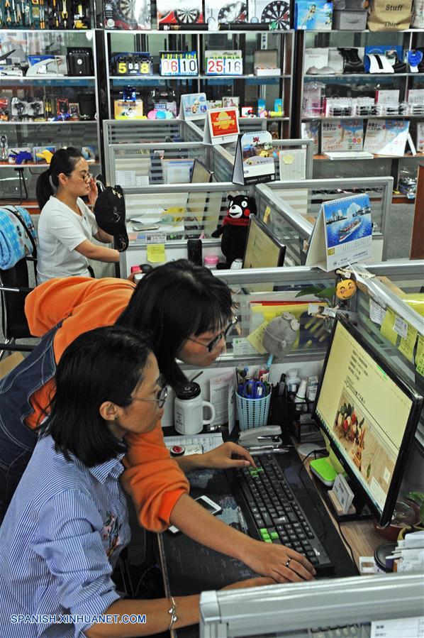 ZHEJIANG, noviembre 13, 2018 (Xinhua) -- Imagen del 25 de octubre de 2018 de empleados trabajando en una compa?ía de servicios de comercio electrónico en Yiwu, en la provincia de Zhejiang, en el este de China. Hace 40 a?os, Yiwu fue un peque?o condado agrícola en la mitad de la provincia de Zhejiang. Desde la reforma y apertura de China, el condado ha aprovechado todas las oportunidades para continuamente desarrollar e innovar su economía. Después de 40 a?os de desarrollo, Yiwu, una ciudad a nivel de condado, ha sido conocida como el mercado mayorista más grande del mundo de materias primas de uso diario. (Xinhua/Tan Jin)