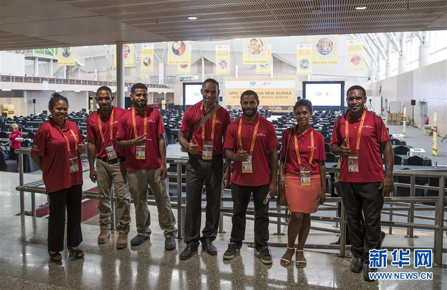 El 13 de noviembre, varios miembros del personal se hicieron una foto en el Centro Internacional de Medios de APEC en Port Moresby, Papúa Nueva Guinea. Por Bai Xuefei, Agencia de Noticias Xinhua