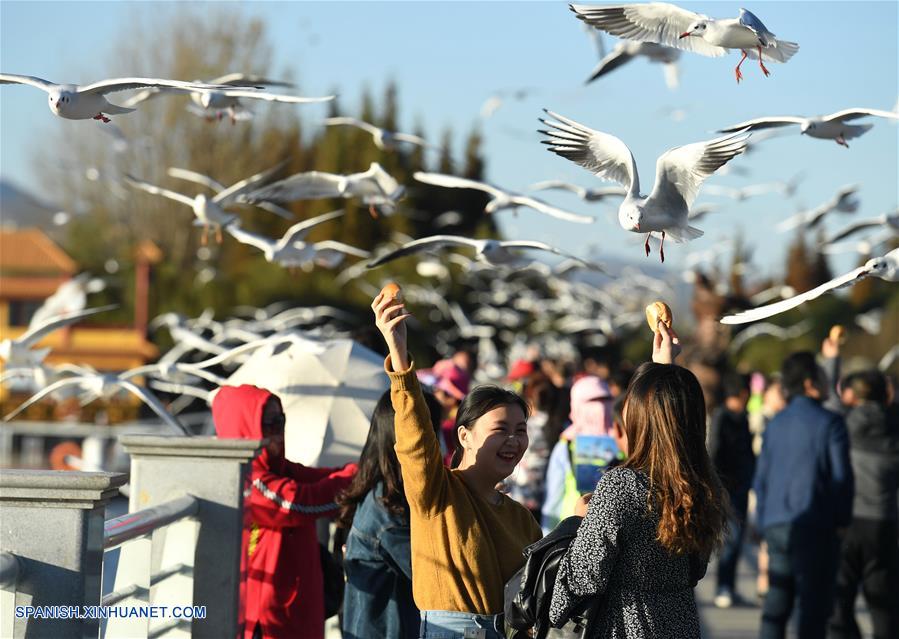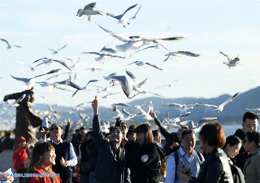 YUNNAN, noviembre 14, 2018 (Xinhua) -- Personas alimentan gaviotas de pico rojo en el Lago Dianchi, en Kunming, capital de la provincia de Yunnan, en el suroeste de China, el 14 de noviembre de 2018. Las gaviotas de pico rojo vuelan a Kunming en busca de un clima más cálido para pasar el invierno. (Xinhua/Lin Yiguang)
