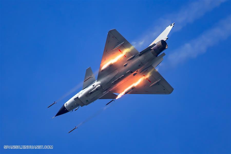 BEIJING, noviembre 14, 2018 (Xinhua) -- Imagen del 11 de diciembre de 2017 de un avión de combate de la fuerza aérea china participando en un ejercicio de patrulla regular. La Fuerza Aérea de China anunció una hoja de ruta para construir una fuerza aérea moderna más fuerte en tres pasos. La construcción de una fuerza aérea moderna más fuerte está acorde con el objetivo general de construir la defensa nacional y las fuerzas armadas, dijo el subcomandante de la Fuerza Aérea china, el teniente general Xu Anxiang, en conferencia de prensa en Zhuhai, en la provincia meridional de Guangdong, sobre la celebración del 69 aniversario del establecimiento de la Fuerza Aérea china llevada a cabo en Zhuhai, provincia de Guangdong, el 11 de noviembre de 2018. (Xinhua/Shao Jing)