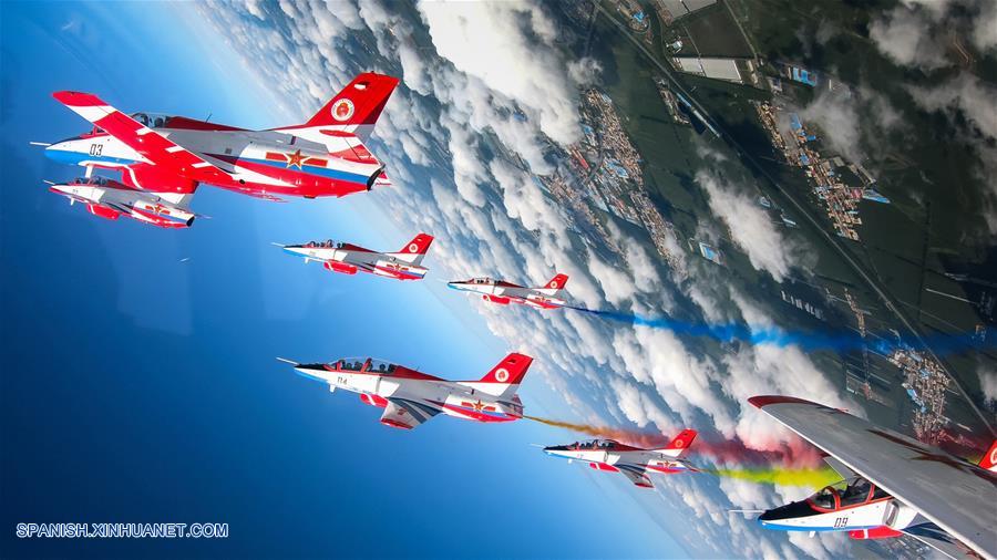 BEIJING, noviembre 14, 2018 (Xinhua) -- Imagen del 30 de agosto de 2018 del Equipo de Demostración Aérea Halcón Rojo participando durante una actividad del día de apertura en la Universidad de Aviación de las Fuerzas Aéreas, en Changchun, capital de la provincia de Jilin, en el noreste de China. La Fuerza Aérea de China anunció una hoja de ruta para construir una fuerza aérea moderna más fuerte en tres pasos. La construcción de una fuerza aérea moderna más fuerte está acorde con el objetivo general de construir la defensa nacional y las fuerzas armadas, dijo el subcomandante de la Fuerza Aérea china, el teniente general Xu Anxiang, en conferencia de prensa en Zhuhai, en la provincia meridional de Guangdong, sobre la celebración del 69 aniversario del establecimiento de la Fuerza Aérea china llevada a cabo en Zhuhai, provincia de Guangdong, el 11 de noviembre de 2018. (Xinhua/Yang Pan)