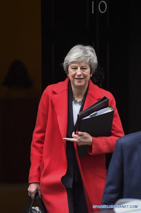 LONDRES, noviembre 15, 2018 (Xinhua) -- La primera ministra de Reino Unido, Theresa May, sale del número 10 de la calle Downing para hablar en el Parlamento británico sobre el acuerdo preliminar de "Brexit", en Londres, Reino Unido, el 15 de noviembre de 2018. (Xinhua/Stephen Chung)