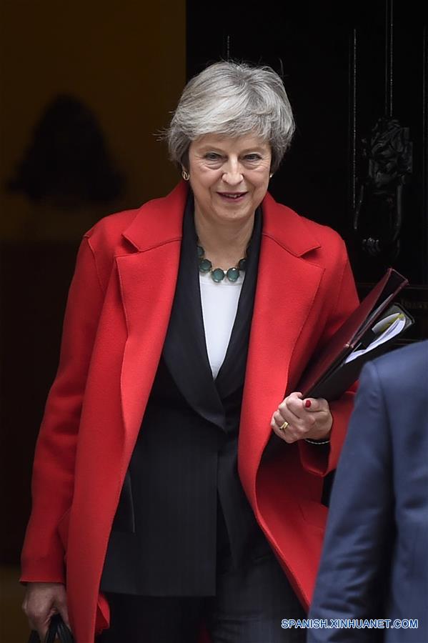 LONDRES, noviembre 15, 2018 (Xinhua) -- La primera ministra de Reino Unido, Theresa May, sale del número 10 de la calle Downing para hablar en el Parlamento británico sobre el acuerdo preliminar de "Brexit", en Londres, Reino Unido, el 15 de noviembre de 2018. (Xinhua/Stephen Chung)