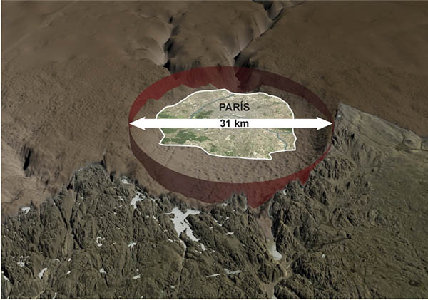 El diámetro del cráter es de 31 km, mayor que la ciudad de París. MUSEO DE HISTORIA NATURAL DE DINAMARCA