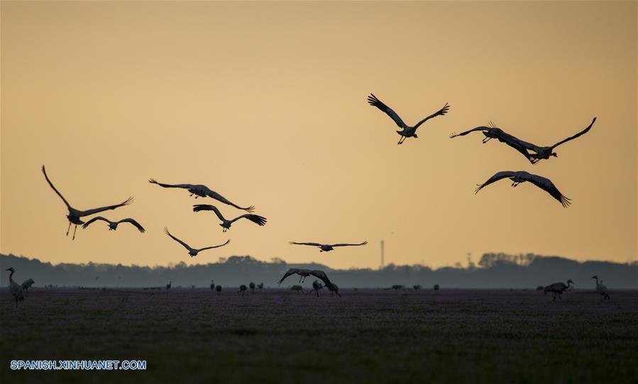 JIANGXI, noviembre 16, 2018 (Xinhua) -- Imagen del 9 de noviembre de 2018 de grullas grises volando sobre el humedal Duchang del Lago Poyang, en la provincia de Jiangxi, en el este de China. El Lago Poyang, el más grande de agua dulce en China, ha atestiguado una parvada de aves migratorias hibernando. (Xinhua/Fu Jianbin)