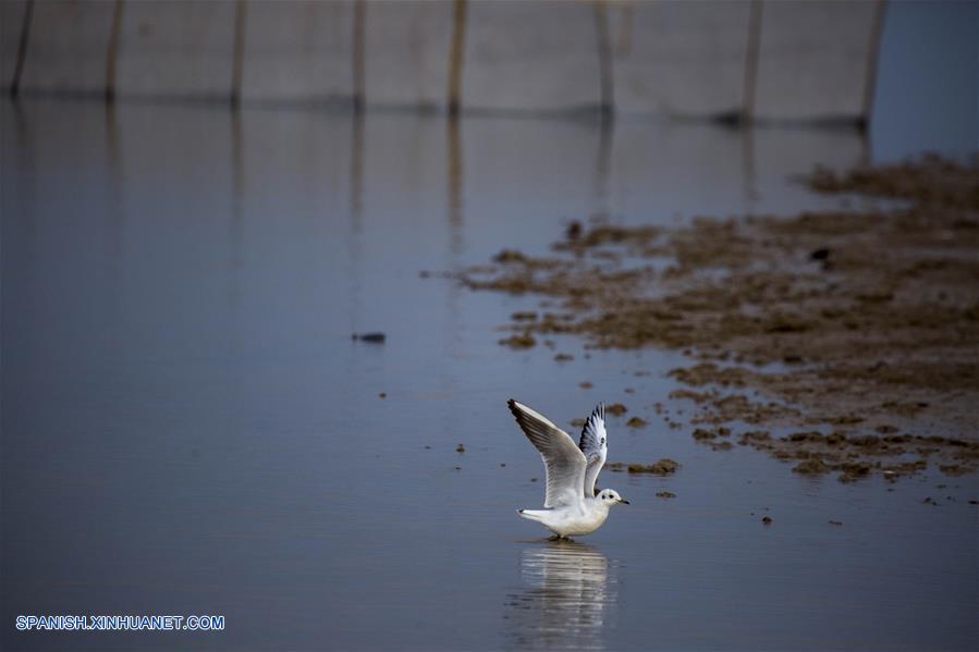 JIANGXI, noviembre 16, 2018 (Xinhua) -- Imagen del 14 de noviembre de 2018 de una gaviota nadando en el humedal Duchang del Lago Poyang, en la provincia de Jiangxi, en el este de China. El Lago Poyang, el más grande de agua dulce en China, ha atestiguado una parvada de aves migratorias hibernando. (Xinhua/Fu Jianbin)