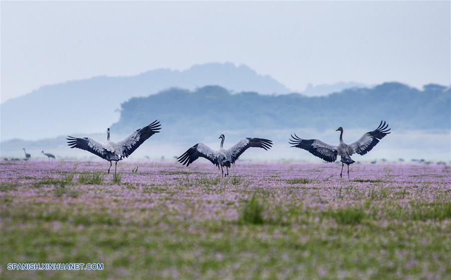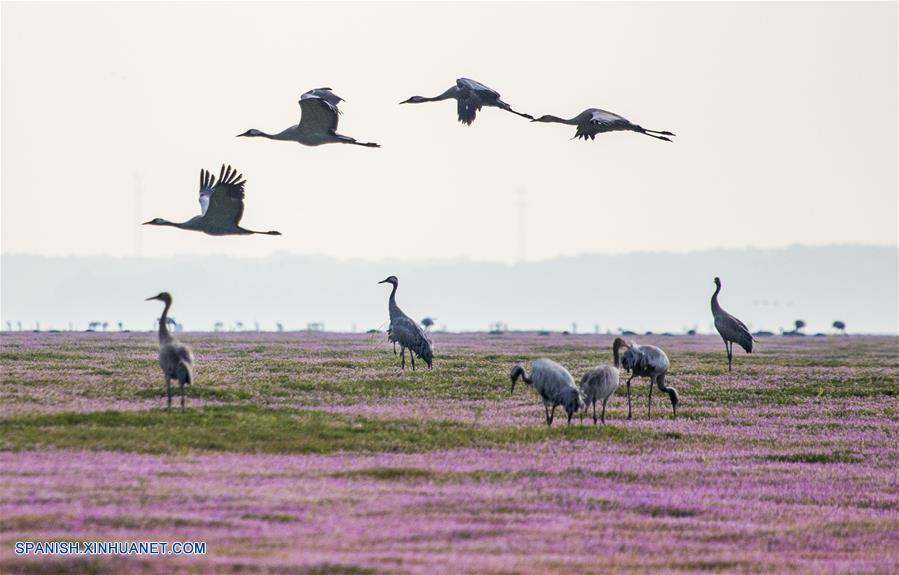 JIANGXI, noviembre 16, 2018 (Xinhua) -- Imagen del 14 de noviembre de 2018 de grullas grises volando sobre el humedal Duchang del Lago Poyang, en la provincia de Jiangxi, en el este de China. El Lago Poyang, el más grande de agua dulce en China, ha atestiguado una parvada de aves migratorias hibernando. (Xinhua/Fu Jianbin)