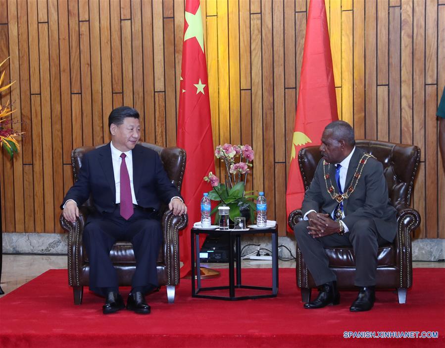 PORT MORESBY, noviembre 16, 2018 (Xinhua) -- El presidente chino, Xi Jinping (i), se reúne con el gobernador general de Papúa Nueva Guinea (PNG), Bob Dadae, en Port Moresby, PNG, el 16 de noviembre de 2018. (Xinhua/Ju Peng)