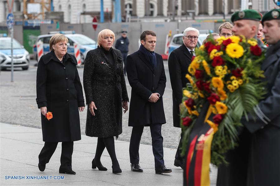 BERLIN, noviembre 18, 2018 (Xinhua) -- El presidente francés Emmanuel Macron (c), el presidente alemán, Frank-Walter Steinmeier (2-d), y la canciller alemana, Angela Merkel (i), asisten a una ceremonia de colocación de una guirnalda en el memorial Neue Wache, en Berlín, capital de Alemania, el 18 de noviembre de 2018. El presidente de Francia, Emmanuel Macron, se dirigió el domingo a los legisladores alemanes y pidió la apertura de un nuevo capítulo para Europa y hacerla más integrada, más fuerte y más independiente. Macron visitó el domingo Berlín para asistir a una serie de eventos para conmemorar el Día de Duelo Nacional de Alemania, y se reunió con la canciller alemana, Angela Merkel. (Xinhua/Shan Yuqi)