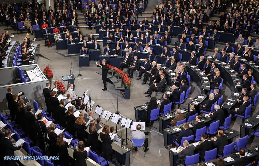 BERLIN, noviembre 18, 2018 (Xinhua) -- Personas participan durante un evento para conmemorar el Día de Duelo Nacional de Alemania, en el Parlamento Federal alemán, en Berlín, capital de Alemania, el 18 de noviembre de 2018. El presidente de Francia, Emmanuel Macron, se dirigió el domingo a los legisladores alemanes y pidió la apertura de un nuevo capítulo para Europa y hacerla más integrada, más fuerte y más independiente. Macron visitó el domingo Berlín para asistir a una serie de eventos para conmemorar el Día de Duelo Nacional de Alemania, y se reunió con la canciller alemana, Angela Merkel. (Xinhua/Shan Yuqi)