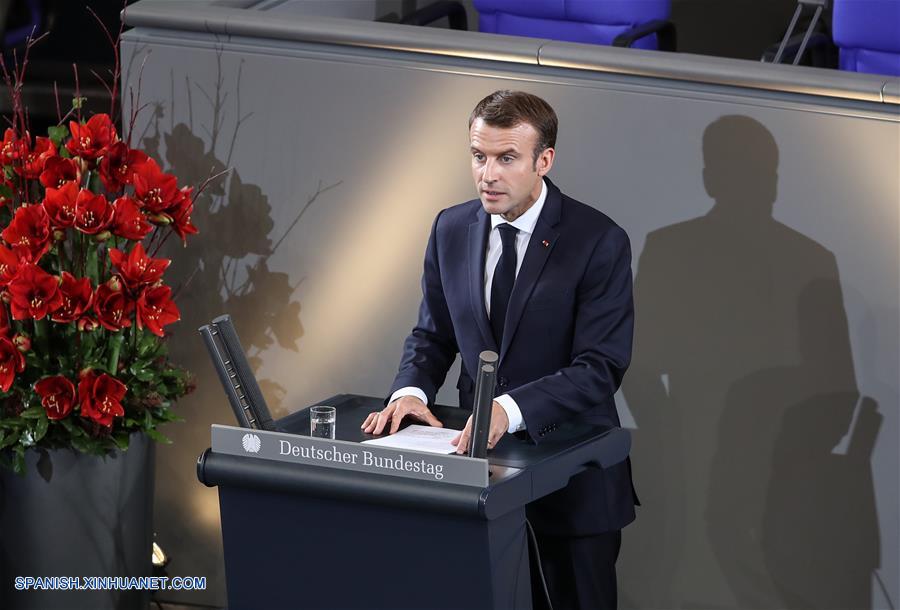 BERLIN, noviembre 18, 2018 (Xinhua) -- El presidente francés Emmanuel Macron pronuncia un discurso para conmemorar el Día de Duelo Nacional de Alemania, en el Parlamento Federal alemán, en Berlín, capital de Alemania, el 18 de noviembre de 2018. El presidente de Francia, Emmanuel Macron, se dirigió el domingo a los legisladores alemanes y pidió la apertura de un nuevo capítulo para Europa y hacerla más integrada, más fuerte y más independiente. Macron visitó el domingo Berlín para asistir a una serie de eventos para conmemorar el Día de Duelo Nacional de Alemania, y se reunió con la canciller alemana, Angela Merkel. (Xinhua/Shan Yuqi)