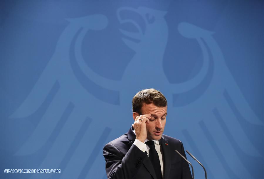 BERLIN, noviembre 18, 2018 (Xinhua) -- El presidente francés Emmanuel Macron participa durante una conferencia de prensa conjunta con la canciller alemana, Angela Merkel, en la sede de la Cancillería alemana, en Berlín, capital de Alemania, el 18 de noviembre de 2018. El presidente de Francia, Emmanuel Macron, se dirigió el domingo a los legisladores alemanes y pidió la apertura de un nuevo capítulo para Europa y hacerla más integrada, más fuerte y más independiente. Macron visitó el domingo Berlín para asistir a una serie de eventos para conmemorar el Día de Duelo Nacional de Alemania, y se reunió con la canciller alemana, Angela Merkel. (Xinhua/Shan Yuqi)
