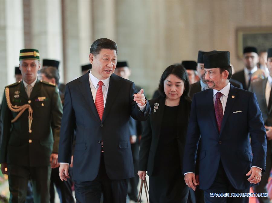 El presidente chino, Xi Jinping (i-frente), conversa con el sultán Haji Hassanal Bolkiah de Brunéi, en Bandar Seri Begawan, Brunéi, el 19 de noviembre de 2018. Xi sostuvo conversaciones con Haji Hassanal Bolkiah en Bandar Seri Begawan el lunes. (Xinhua/Ju Peng)