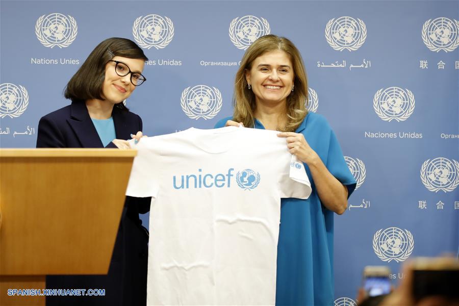 NUEVA YORK, noviembre 20, 2018 (Xinhua) -- La actriz británica Millie Bobby Brown (i), recibe una camiseta de manos de Paloma Escudero (d), directora de Comunicaciones para el Fondo de las Naciones Unidas para la Infancia (UNICEF, por sus siglas en inglés) durante una conferencia de prensa, en la sede de la Organización de las Naciones Unidas (ONU), en Nueva York, Estados Unidos, el 20 de noviembre de 2018. La actriz británica Millie Bobby Brown prometió el martes abogar por los derechos de los ni?os en su nuevo papel como la embajadora de buena voluntad más joven de UNICEF. En una conferencia de prensa en la sede de la ONU, Brown de 14 a?os de edad fue nombrada en el cargo y recibió una camiseta de Unicef de la directora de Comunicaciones de la agencia, Paloma Escudero, con motivo del Día Universal del Ni?o. (Xinhua/Li Muzi)