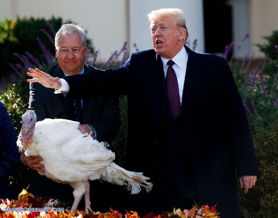 WASHINGTON, D.C., noviembre 20, 2018 (Xinhua) -- El presidente estadounidense, Donald Trump (d), participa en la Ceremonia del Perdón del Pavo, en vísperas del Día de Acción de Gracias, en el Jardín de las Rosas de la Casa Blanca, en Washington, D.C., Estados Unidos, el 20 de noviembre de 2018. (Xinhua/Ting Shen)