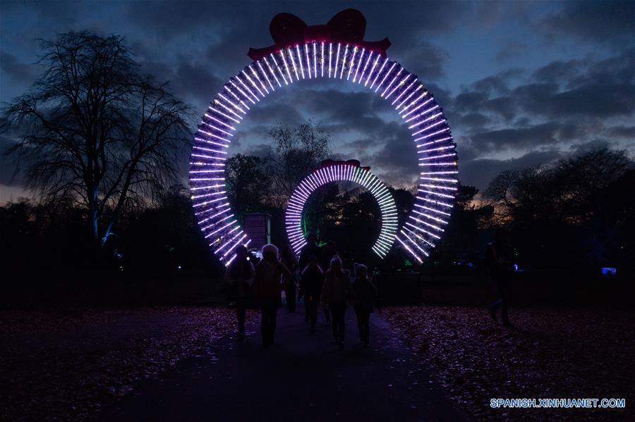 Visitantes observan luces navide?as exhibidas en los Jardines Botánicos Reales, Kew, en Londres, Reino Unido, el 21 de noviembre de 2018. De acuerdo con información de la prensa local, el evento "Navidad en Kew" se llevará a cabo del 22 de noviembre de 2018 al 5 de enero de 2019, permitiendo a los visitantes disfrutar de un espectáculo de luces en el sitio. (Xinhua/Ray Tang)
