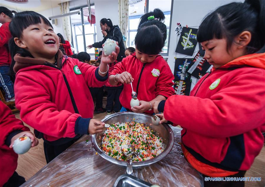 ZHEJIANG, noviembre 21, 2018 (Xinhua) -- Ni?as usan arroz glutinoso, verduras y huevo de pato en salazón para elaborar un tipo de alimento tradicional durante una actividad llevada a cabo en un jardín de ni?os, en el municipio de Lijiaxiang del condado de Changxing, provincia de Zhejiang, en el este de China, el 21 de noviembre de 2018. La actividad se llevó a cabo el miércoles para saludar a la nevada ligera, uno de los 24 términos solares del calendario lunar chino. (Xinhua/Xu Yu)