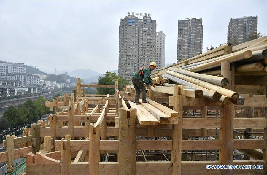 Un carpintero construye viviendas sobre pilotes con habilidades tradicionales por el río Gongshui, en el centro del condado de Xuan'en, provincia de Hubei, en el centro de China, el 21 de noviembre de 2018. Un total de cinco viviendas sobre pilotes fueron construidas en el condado para mostrar la cultura local del grupo étnico Tujia a los turistas. La técnica de construcción de las viviendas sobre pilotes del grupo étnico Tujia fue inscrita en el Patrimonio Cultural Intangible Nacional en 2011. (Xinhua/Song Wen)