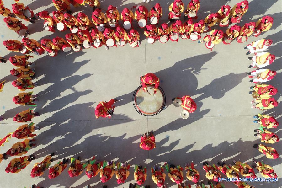 El artista popular Wang Guoqiang (c) muestra sus habilidades para tocar el tambor en la Escuela Primaria Changxin, en la ciudad de Xingtai, provincia de Hebei, en el norte de China, el 21 de noviembre de 2018. Los ni?os tuvieron la oportunidad de aprender música folclórica en la escuela como un esfuerzo para enriquecer la vida escolar y promover la cultura tradicional. (Xinhua/Chen Lei)
