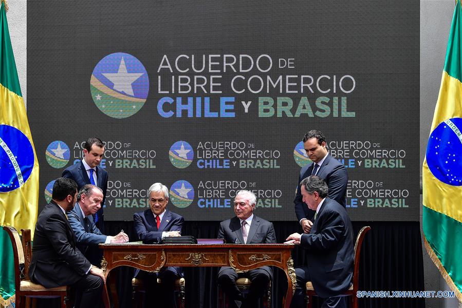 El presidente de Chile, Sebastián Pi?era (4-i), y el presidente de Brasil, Michel Temer (3-d), participan durante una firma de acuerdos llevada a cabo en el Palacio de La Moneda, en la cuidad de Santiago, capital de Chile, el 21 de noviembre de 2018. El presidente de Brasil, Michel Temer, partió en la ma?ana del miércoles rumbo a Santiago de Chile, donde firmará con su homólogo Sebastián Pi?era un acuerdo de libre comercio entre los dos países. La expectativa es que el acuerdo incremente el comercio bilateral, ampliando las transacciones y elevando el volumen de mercancías y productos. Uno de los principales puntos involucra el fin del cobro de itinerancia internacional para datos y telefonía móvil entre los dos países. (Xinhua/Jorge Villegas)
