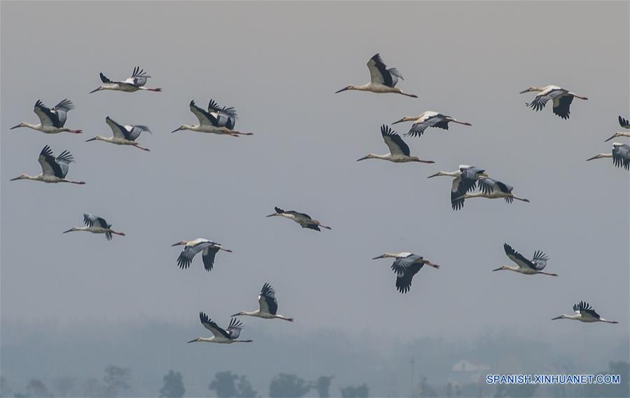 ANHUI, noviembre 22, 2018 (Xinhua) -- Imagen del 21 de noviembre de 2018 de una bandada de cigüe?as blancas orientales volando sobre el parque nacional de humedales Bandao, en Chaohu, provincia de Anhui, en el este de China. Más de 100 cigüe?as blancas orientales volaron al parque recientemente por comida y descanso. (Xinhua/Guo Chen)