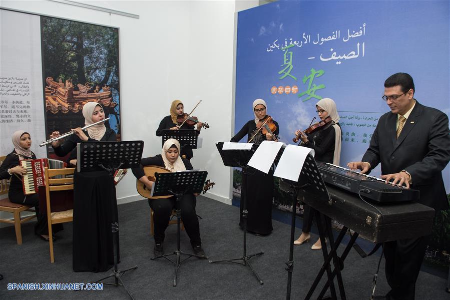 ISMAILIA, noviembre 22, 2018 (Xinhua) -- Imagen del 21 de noviembre de 2018, de maestros y estudiantes de la Universidad del Canal de Suez tocando la canción folclórica china "Flor de Jazmín" durante una exposición cultural que presenta a Beijing, capital de China, en Ismailía, Egipto. La exposición fue inaugurada el miércoles en el edificio del Instituto Confucio de la Universidad del Canal de Suez. "La exposición está destinada a proporcionar a los visitantes, especialmente estudiantes de idioma chino, información de amplio alcance sobre Beijing", dijo Hassan Ragab, director del Instituto Confucio de la Universidad del Canal de Suez. (Xinhua/Meng Tao)