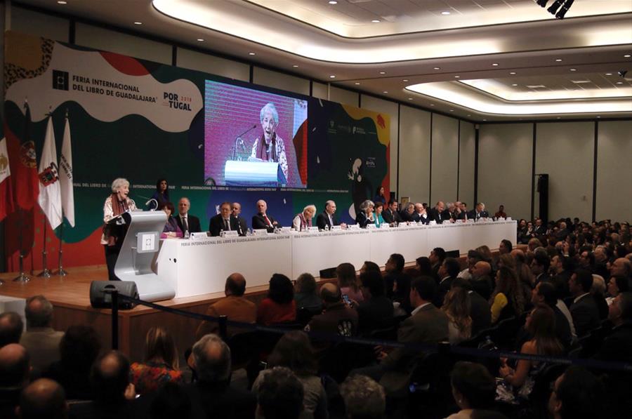 La poeta uruguaya Ida Vitale (i), pronuncia un discurso durante el evento inaugural de la 32 Feria Internacional del Libro de Guadalajara (FILG), en la ciudad de Guadalajara, estado de Jalisco, México, el 24 de noviembre de 2018. La ganadora del Premio Cervantes 2018, la poeta uruguaya Ida Vitale, fue galardonada con el Premio FIL de Literatura en Lenguas Romances el sábado durante la inauguración de la FILG. En esta edición la feria tiene como invitado de honor a Portugal, de acuerdo con información de la prensa local. (Xinhua/Bernardette Gómez)