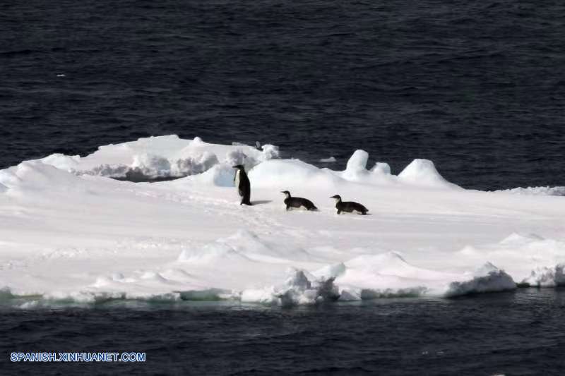 A BORDO DEL XUELONG, noviembre 25, 2018 (Xinhua) -- Pingüinos emperador permanecen sobre un trozo de hielo flotante en el Océano Antártico, el 25 de noviembre de 2018. El rompehielos de investigación Xuelong de China, conocido también como Dragón de Nieve, entró a una zona de hielo flotante en el Océano Antártico para evitar un ciclón. El área de hielo esta ubicada a 61.55 gradoas latitud sur y 110.37 longitud este. (Xinhua/Liu Shiping)