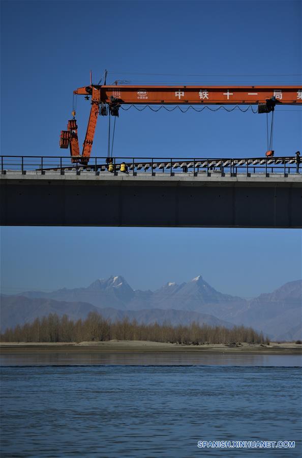 Empleados colocan vías en el puente sobre del Río Yarlung de la sección de Lhasa-Nyingchi, de la vía de ferrocarril Sichuan-Tibet, en el condado de Gonggar, en la Región Autónoma del Tibet, en el suroeste de China, el 26 de noviembre de 2018. El puente del Río Yarlung Zangbo, el primer puente sobre el río de la sección Lhasa-Nyingchi de la vía de ferrocarril Sichuan-Tibet, comenzó el lunes su colocación de vías. (Xinhua/Purbu Zhaxi)