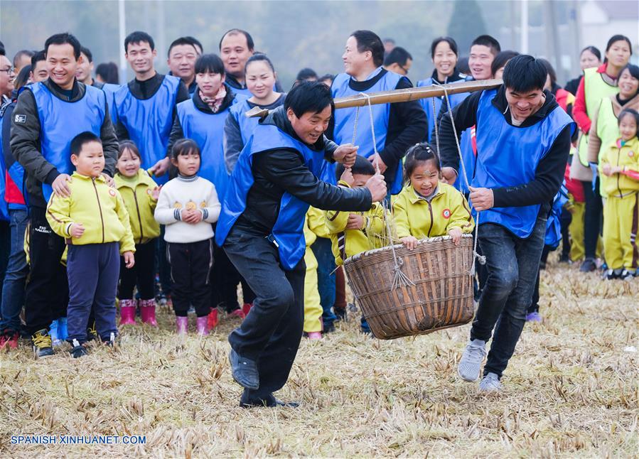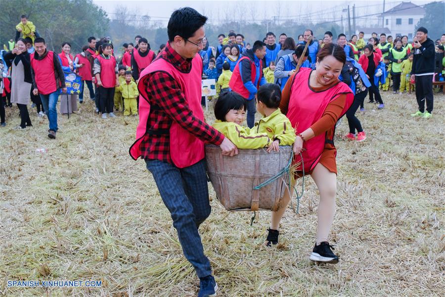 ZHEJIANG, noviembre 28, 2018 (Xinhua) -- Padres e hijos asisten a una actividad recreativa en un arrozal, en Changxing, provincia de Zhejiang, en el este de China, el 28 de noviembre de 2018. El evento fue organizado el miércoles por un jardín de ni?os local para elevar la conciencia sobre la buena forma física y fomentar la interacción entre padres e hijos. (Xinhua/Xu Yu)
