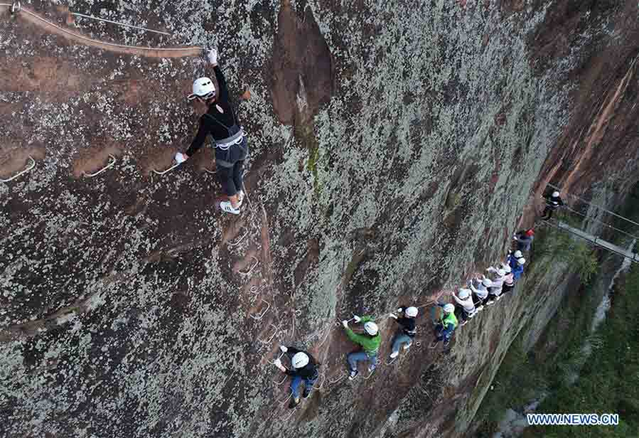 Los visitantes escalan como parte de los deportes invernales al aire libre que pueden practicar en un parque deportivo de Cili, Zhangjiajie, Hunan, 28 de noviembre del 2018. Muchos turistas visitan Hunan atraídos por los deportes de invierno al aire libre. (Foto: Xinhua/ Wu Yongbing)