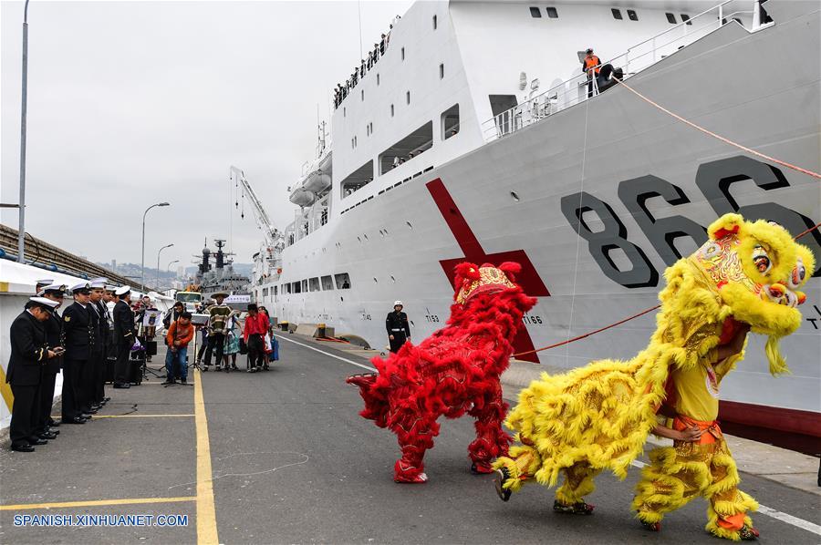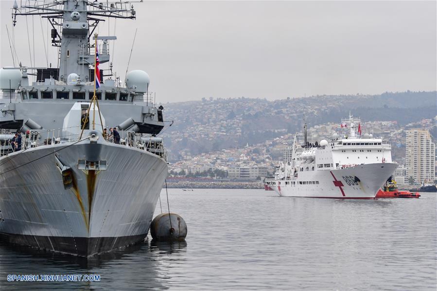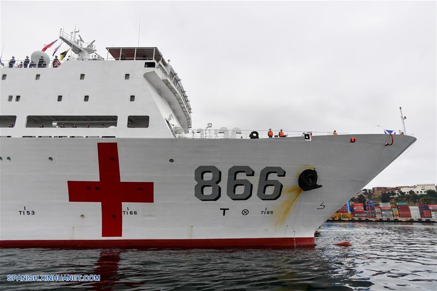 VALPARAISO, noviembre 29, 2018 (Xinhua) -- El buque hospital de China, Arca de la Paz, llega al puerto marítimo de Valparaíso, Chile, el 29 de noviembre de 2018. Tradicionales bailes chilenos y chinos dieron el jueves la bienvenida al buque hospital de China, Arca de la Paz, que arribó por primera vez al país sudamericano para conmemorar el bicentenario de la Armada de Chile. El buque dedicado a labores humanitarias y atención médica en casos de crisis y catástrofes, se quedará en el puerto de Valparaíso hasta el 7 de diciembre y estará abierto al público local. (Xinhua/Jorge Villegas)