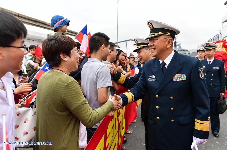 VALPARAISO, noviembre 29, 2018 (Xinhua) -- Ciudadanos chinos residentes en Chile dan la bienvenida a tripulantes del buque hospital de China, Arca de la Paz, en el puerto marítimo de Valparaíso, Chile, el 29 de noviembre de 2018. Tradicionales bailes chilenos y chinos dieron el jueves la bienvenida al buque hospital de China, Arca de la Paz, que arribó por primera vez al país sudamericano para conmemorar el bicentenario de la Armada de Chile. El buque dedicado a labores humanitarias y atención médica en casos de crisis y catástrofes, se quedará en el puerto de Valparaíso hasta el 7 de diciembre y estará abierto al público local. (Xinhua/Jorge Villegas)