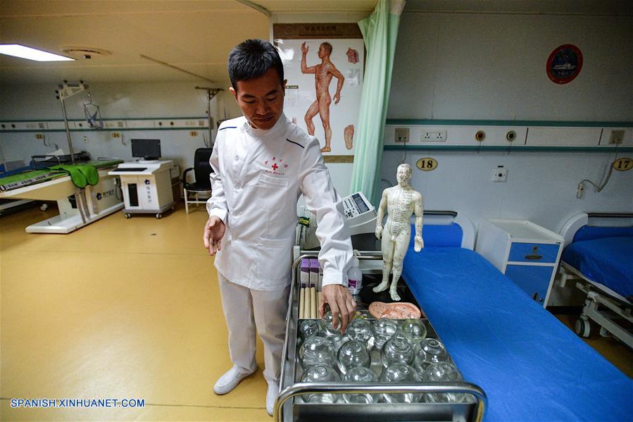 VALPARAISO, noviembre 29, 2018 (Xinhua) -- Un médico chino trabaja en un consultorio del buque hospital de China, Arca de la Paz, en el puerto marítimo de Valparaíso, Chile, el 29 de noviembre de 2018. Tradicionales bailes chilenos y chinos dieron el jueves la bienvenida al buque hospital de China, Arca de la Paz, que arribó por primera vez al país sudamericano para conmemorar el bicentenario de la Armada de Chile. El buque dedicado a labores humanitarias y atención médica en casos de crisis y catástrofes, se quedará en el puerto de Valparaíso hasta el 7 de diciembre y estará abierto al público local. (Xinhua/Jorge Villegas)