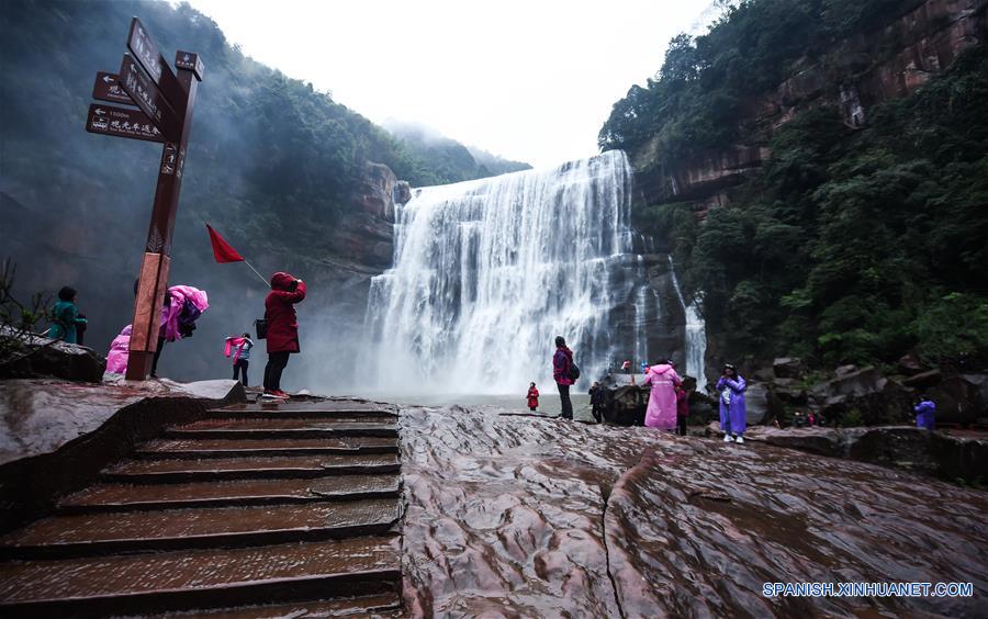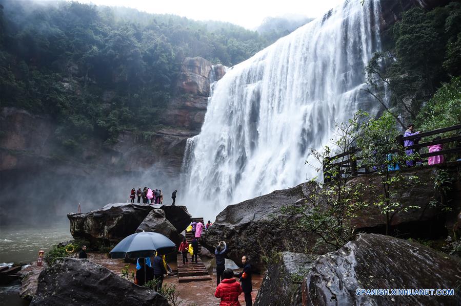 GUIZHOU, noviembre 30, 2018 (Xinhua) -- Imagen del 29 de noviembre de 2018 de turistas visitando la cascada de Chishui, en la ciudad de Chishui, provincia de Guizhou, en el suroeste de China. La ciudad de Chishui ha atraído a muchos turistas debido su buen ambiente ecológico y servicios incluso en días de invierno. (Xinhua/Tao Liang)