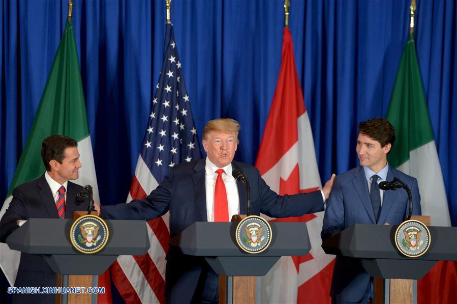 Imagen proveída por la Presidencia de México, del presidente mexicano, Enrique Pe?a Nieto (i), el presidente de Estados Unidos, Donald Trump (c), y el primer ministro de Canadá, Justin Trudeau (d), realizando declaraciones después de firmar el Tratado México-Estados Unidos-Canadá (T-MEC), al margen de su participación en la Cumbre de Líderes del G20, en Buenos Aires, Argentina, el 30 de noviembre de 2018. Los líderes de Canadá, Estados Unidos y México encabezaron el viernes la firma de la versión actualizada del acuerdo de libre comercio para América del Norte, que aseguran fortalecerá los nexos de la región y beneficiará a la clase trabajadora. El primer ministro de Canadá, Justin Trudeau; el presidente de Estados Unidos, Donald Trump; y su homólogo mexicano, Enrique Pe?a Nieto, atestiguaron la firma del nuevo tratado en Buenos Aires, al margen de la Cumbre de Líderes del G20. (Xinhua/Presidencia de México)