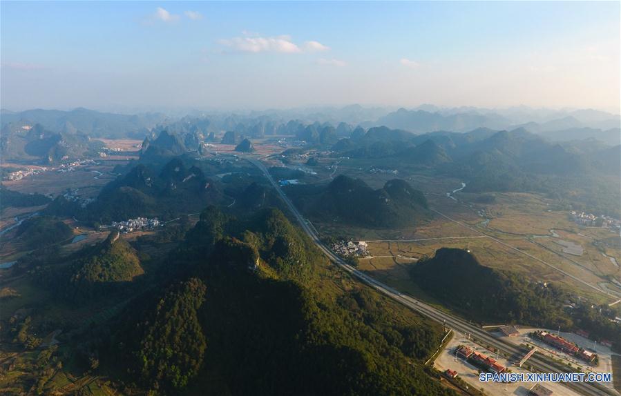 GUANGXI, diciembre 2, 2018 (Xinhua) -- Imagen del 27 de noviembre de 2018, de una vista aérea de las monta?as kársticas en Baise, en la Región Autónoma Zhuang de Guangxi, en el sur de China. Cubriendo un área de alrededor de 36,300 kilómetros cuadrados y con una población de más de 4.1 millones, Baise es una importante base de frutas y vegetales, además de uno de los más importantes productores de aluminio de China. (Xinhua/Huang Xiaobang)