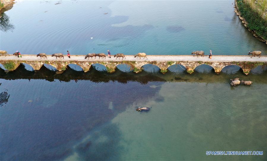 GUANGXI, diciembre 2, 2018 (Xinhua) -- Imagen del 27 de noviembre de 2018, de una vista aérea de aldeanos y búfalos en Baise, en la Región Autónoma Zhuang de Guangxi, en el sur de China. Cubriendo un área de alrededor de 36,300 kilómetros cuadrados y con una población de más de 4.1 millones, Baise es una importante base de frutas y vegetales, además de uno de los más importantes productores de aluminio de China. (Xinhua/Zhou Hua) (