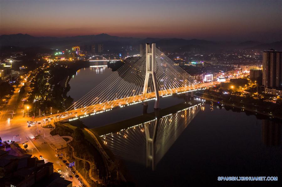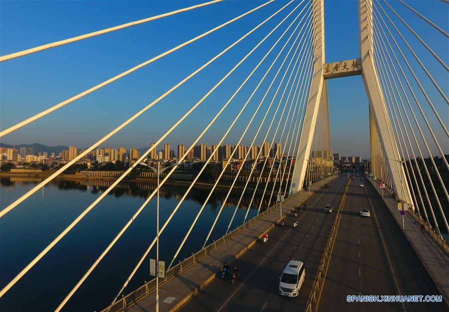 (181202) -- GUANGXI, diciembre 2, 2018 (Xinhua) -- Imagen del 26 de noviembre de 2018, de una vista aérea del Puente Donghe, en Baise, en la Región Autónoma Zhuang de Guangxi, en el sur de China. Cubriendo un área de alrededor de 36,300 kilómetros cuadrados y con una población de más de 4.1 millones, Baise es una importante base de frutas y vegetales, además de uno de los más importantes productores de aluminio de China. (Xinhua/Huang Xiaobang)
