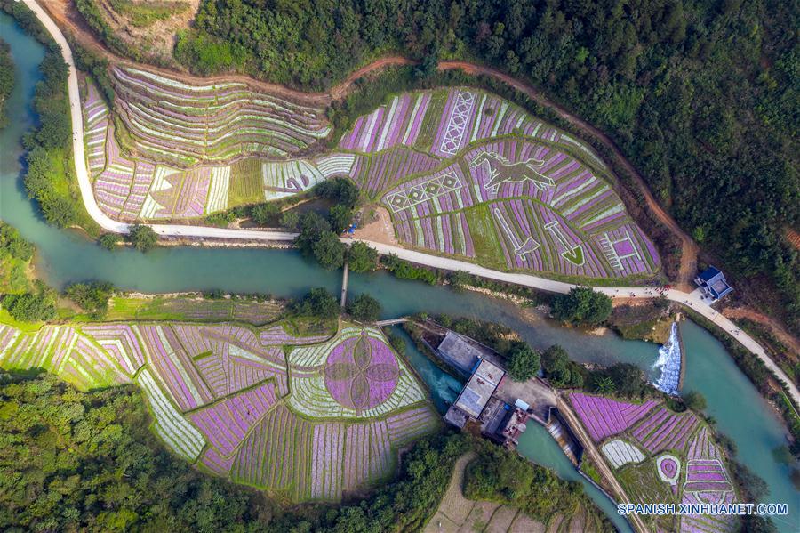 GUANGXI, diciembre 2, 2018 (Xinhua) -- Imagen del 27 de noviembre de 2018, de una vista aérea de granjas de flores en la aldea de Nawen, en el condado de Debao de Baise, en la Región Autónoma Zhuang de Guangxi, en el sur de China. Cubriendo un área de alrededor de 36,300 kilómetros cuadrados y con una población de más de 4.1 millones, Baise es una importante base de frutas y vegetales, además de uno de los más importantes productores de aluminio de China. (Xinhua/Li Xin)