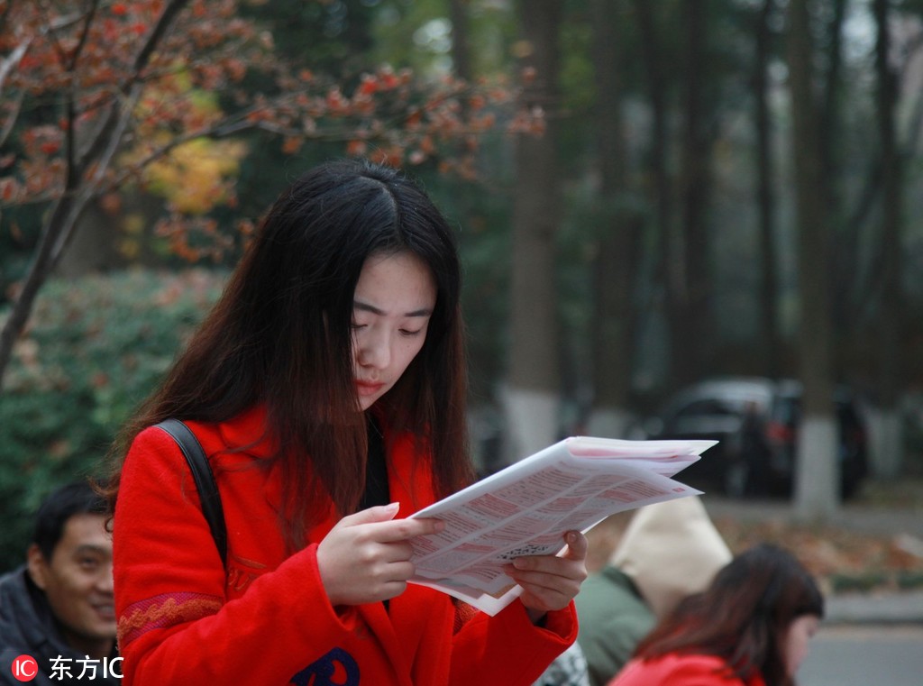 Un candidato revisa materiales antes del examen celebrado en la Universidad Forestal de Nanjing, provincia de Jiangsu. Este domingo, un total de 920.000 personas realizaron el examen de funcionario público nacional para cubrir 14.500 posiciones vacantes, 2 de diciembre del 2018. [Foto: IC]