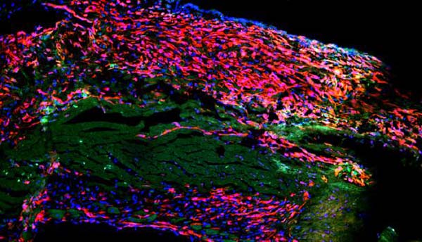 Parte de la pared cardíaca del corazón de ratón después de un infarto de miocardio. Se puede ver el tejido cicatricial (rojo) y las células musculares del corazón muerto (verde). - Hubrecht Institute