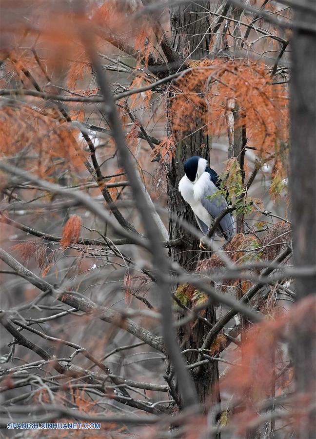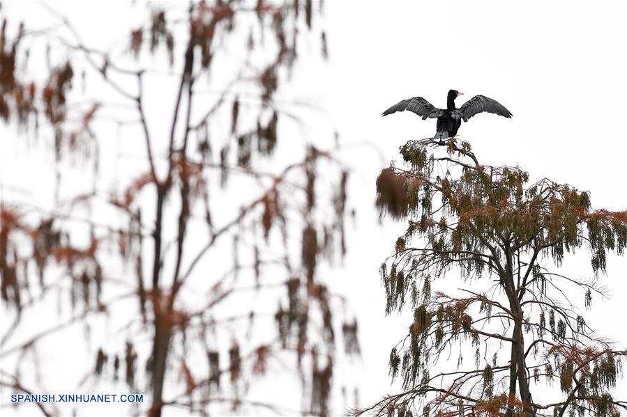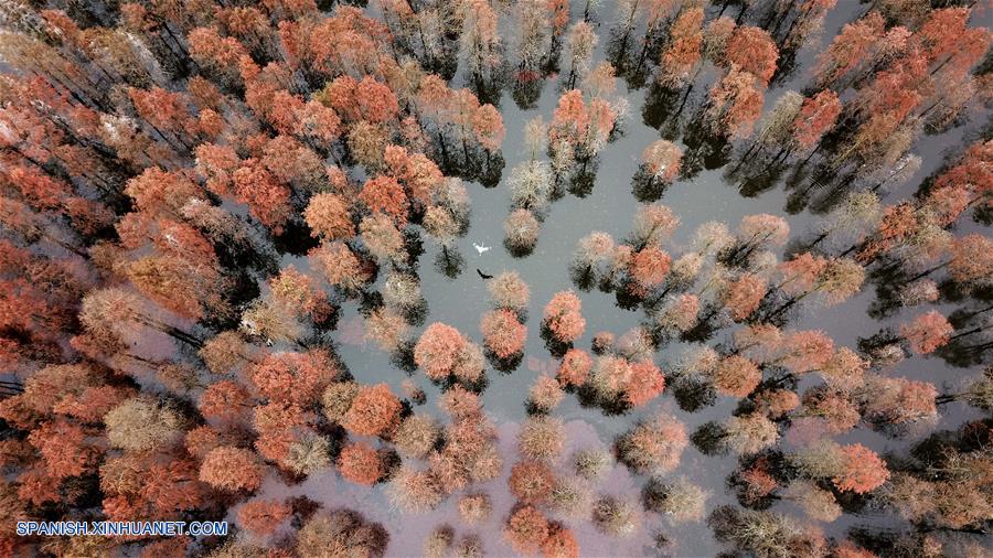 ANHUI, diciembre 7, 2018 (Xinhua) -- Vista aérea de los cipreses de estanque y un ave en el Parque Nacional de Humedales del lago Chishan, en el condado de Lai'an, provincia de Anhui, en el este de China, el 7 de diciembre de 2018. Los cipreses no sólo frenan el agua y la erosión del suelo, sino que también atraen a varios tipos de aves. (Xinhua/Zhang Duan)