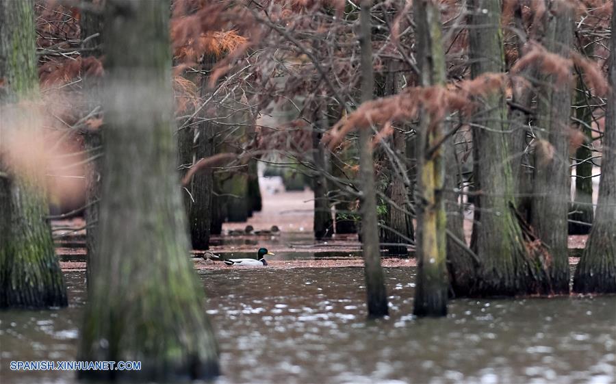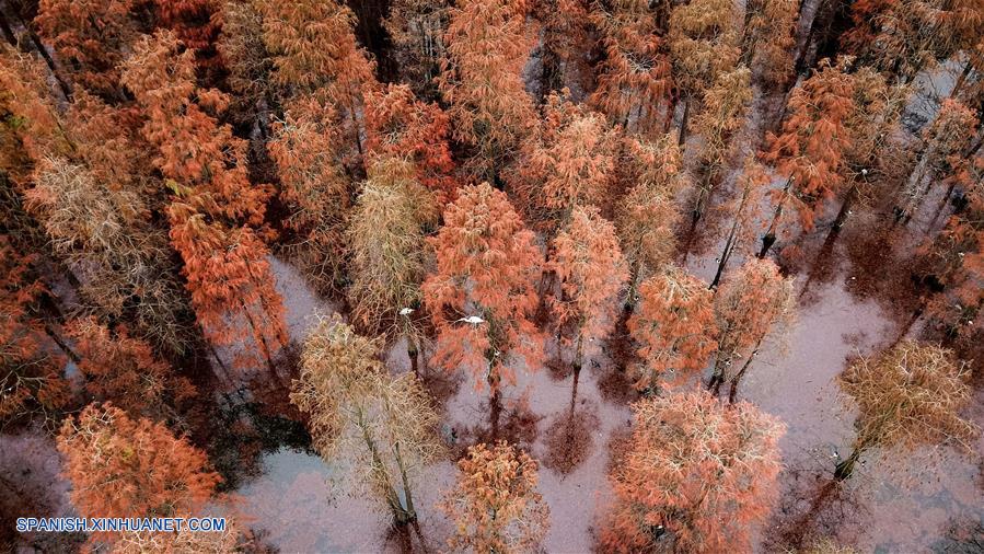 ANHUI, diciembre 7, 2018 (Xinhua) -- Vista aérea de los cipreses de estanque y las aves en el Parque Nacional de Humedales del lago Chishan, en el condado de Lai'an, provincia de Anhui, en el este de China, el 7 de diciembre de 2018. Los cipreses no sólo frenan el agua y la erosión del suelo, sino que también atraen a varios tipos de aves. (Xinhua/Zhang Duan)